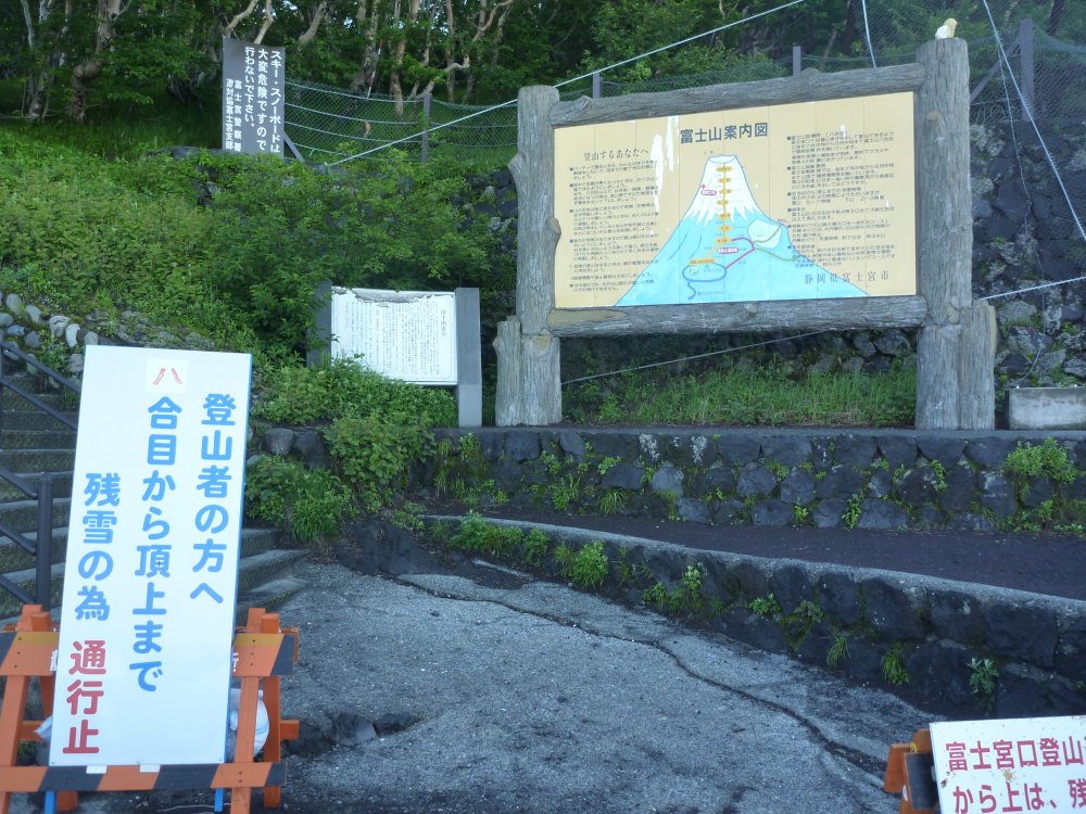 読みにくいけど「8合目から上は雪のため通行止め」との事。