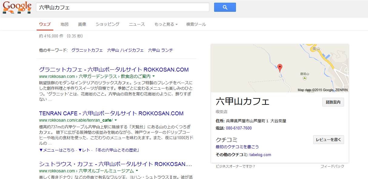 この間気がついたけど、ついに「六甲山カフェ」で検索すると、ちゃんとカフェの位置がgoogle地図に示されるようになりました!