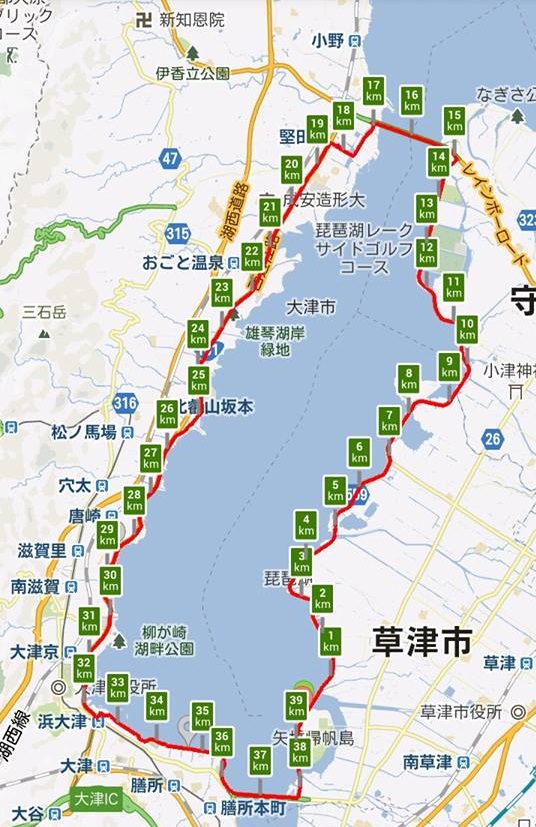 さて、この琵琶湖半周は40キロぐらいなんですけど、40キロって、数字にしたらたいした事無いけど、地図に移してみると、結構遠くまでいけたりするんですよね。