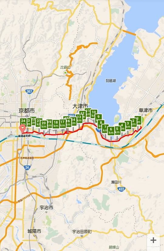 試しに、滋賀県草津駅から京都駅までの距離を測ってみると、大体20キロぐらいでした。