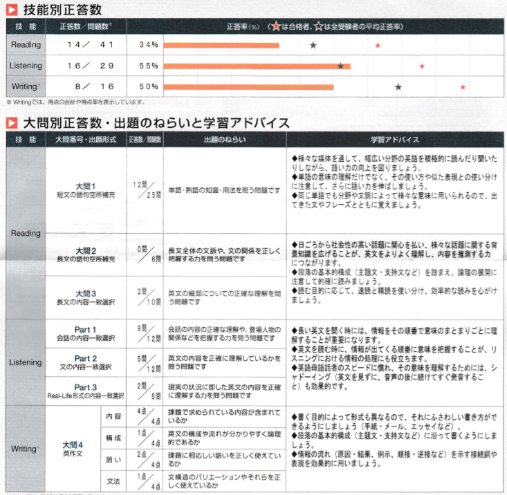 リーディング、リスニング、ライティング技能別の点数や、平均点との比較もだしてくれるんです。