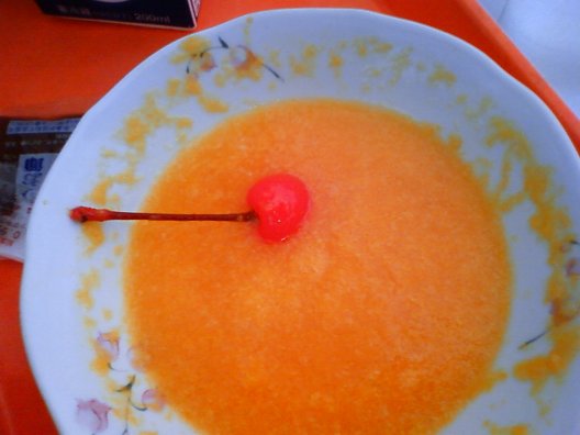 果肉入りのオレンジジュースに入った、さくらんぼ。