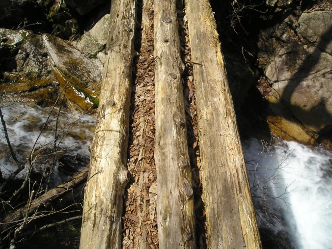 なんか所々割れてて、俺のBMI30オーバーの肉重に耐えきれず、いつでも折れますよ!といわんばかりに軋む丸太橋。