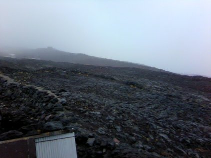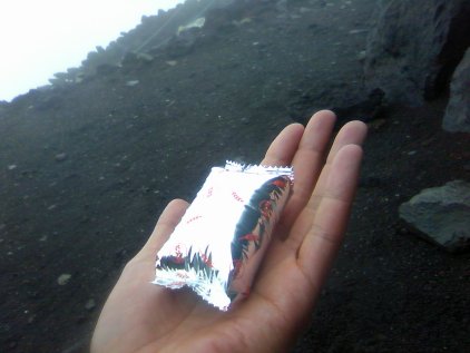 しかも7合目から5合目までの数キロが一直線の道でして、後ろから強風と共に小石とかが飛んできて体中にバシバシ当たるから、立ち止まって休憩するわけにもいかないんですわ。