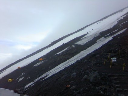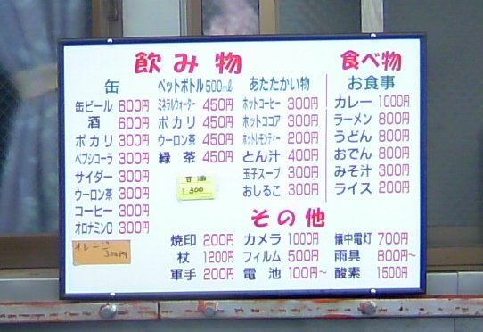 深 夜でも常に人の出入りが有るし、宿の人は普通に雑務してるし、宿の外を歩く登山者の声も余裕で聞こえます。ちなみに俺は部屋ですらなく、台所のコンロの下 で膝を抱えて寝ました。下コンクリ。上のコンロではたまねぎスープが火にかけられて、いい匂いがしてました。それでも数時間キッチリ眠った俺は、我ながら 凄いと思います。