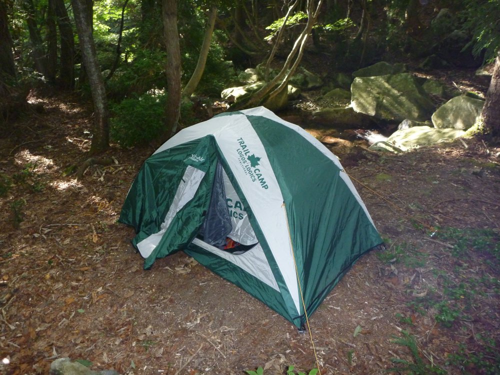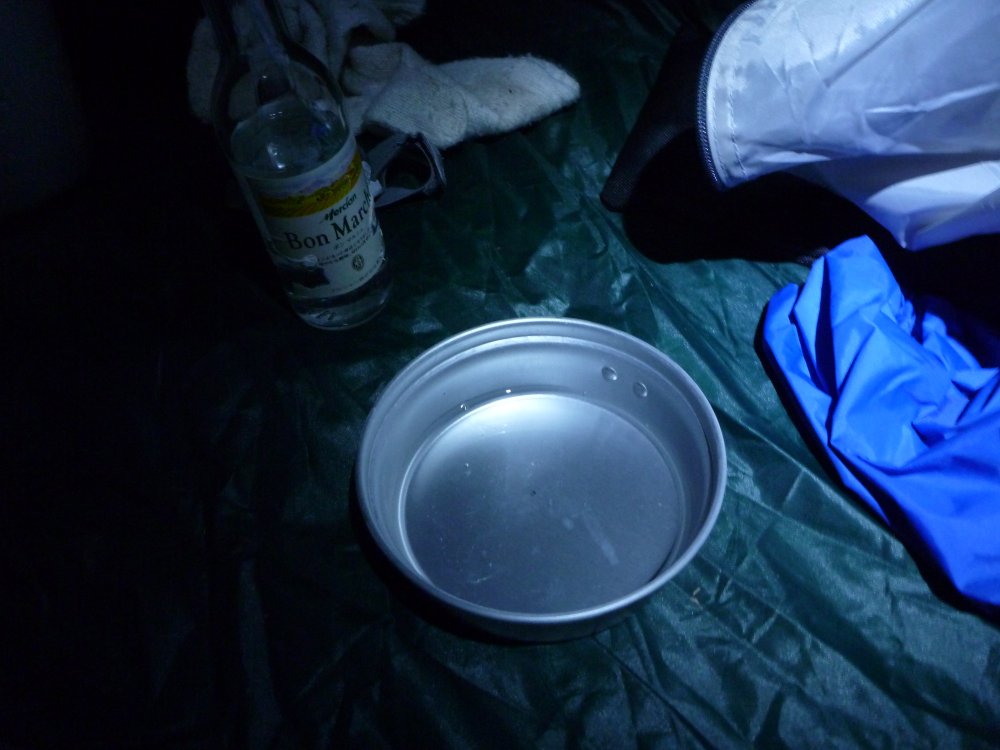 雨が降ってきて、テントの端っこのほうから漏れてきて、カバンで塞いだ記憶があるんだが、起きてみるとカバンは元の位置にあるし。