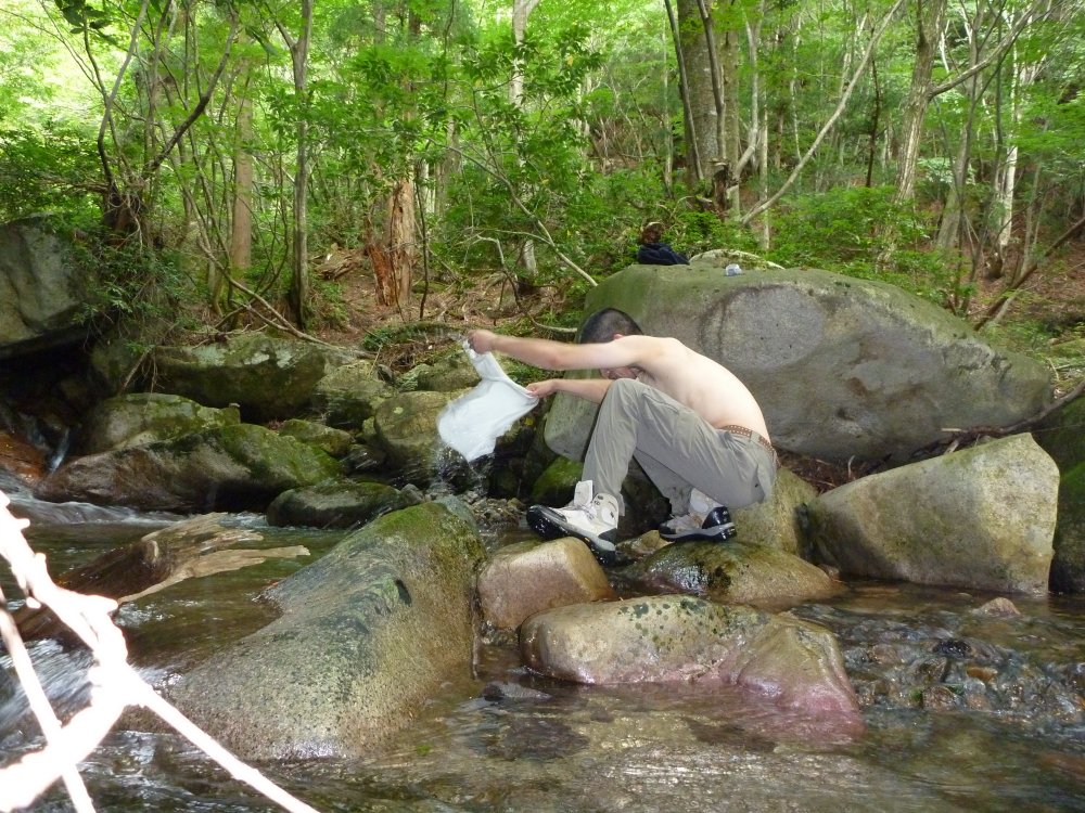 川の水を汲んでこようと、クッカーと御飯を持ってったら、岩で足が滑って見事に転ぶ。