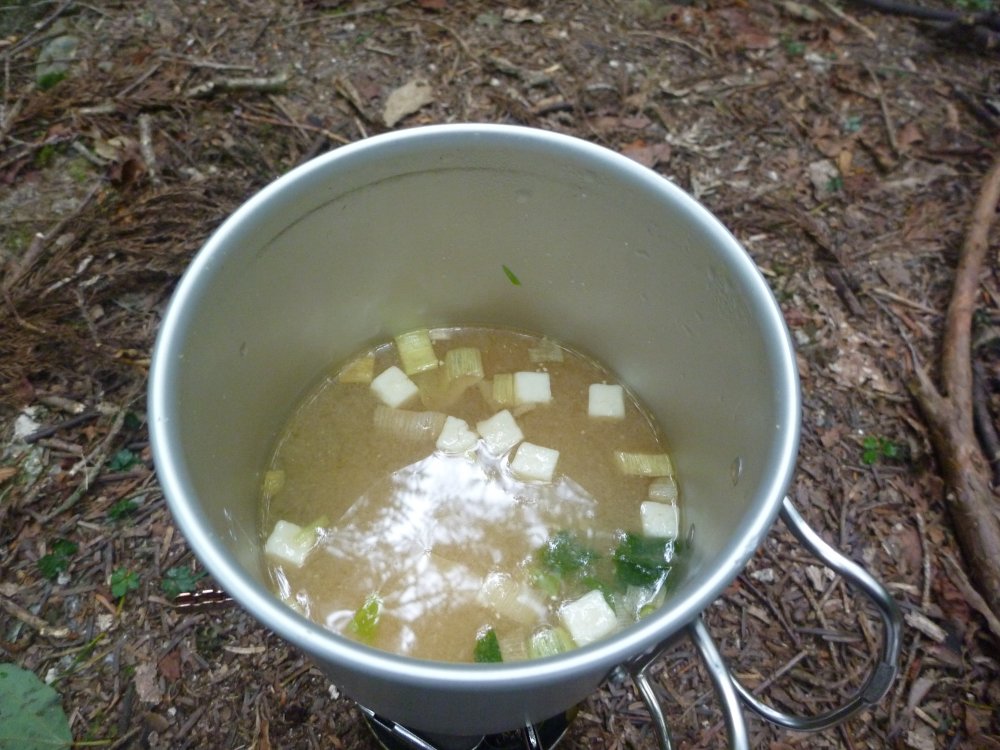 水を沸かし、フリーズドライの長ネギ豆腐味噌汁を作成。