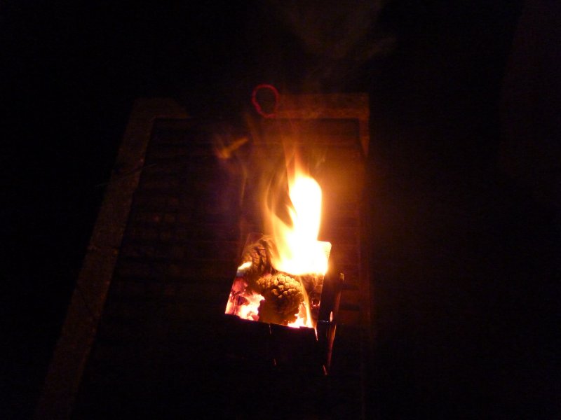そこらじゅうに落ちているマツボックリと枯れ木を拾い集め、ライターを持ってなかったのでバーナーで火をつけ、ストーブに放り込む。