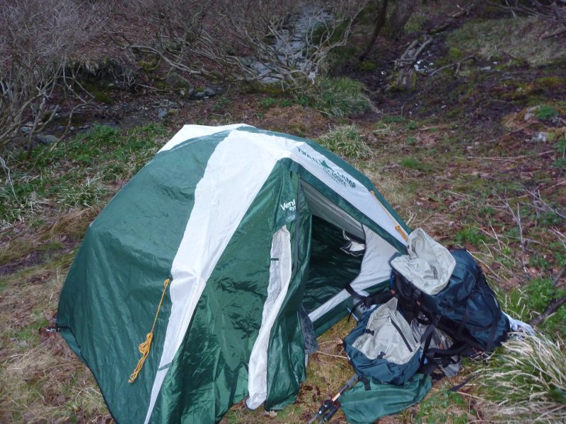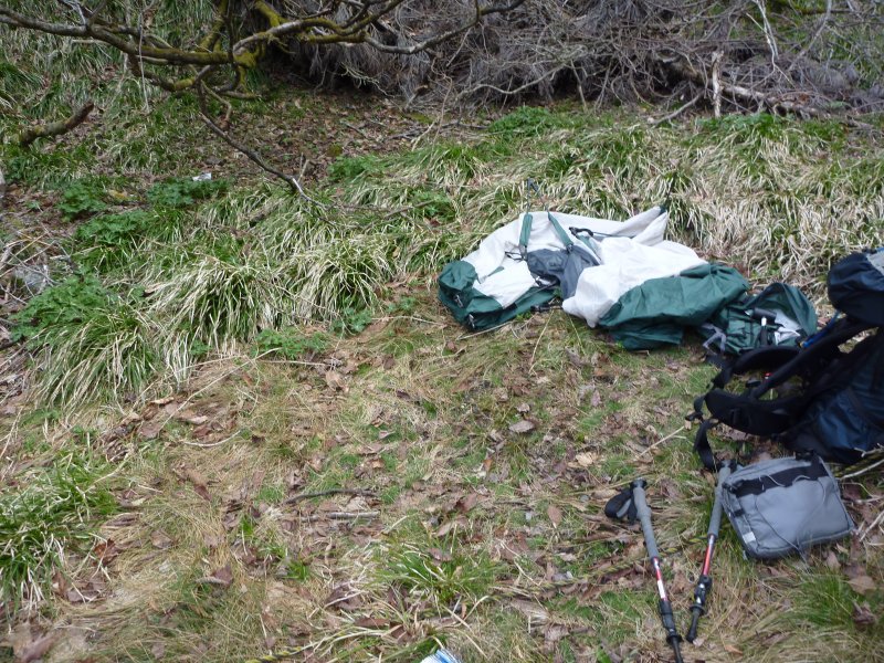 その先にもっと良い所もありそうだったけど、とにかく一秒でも早くテント張って寝転がりたかったので、ちょっと斜めになったその場所にテントを張る。