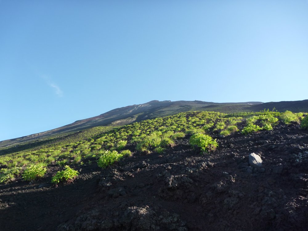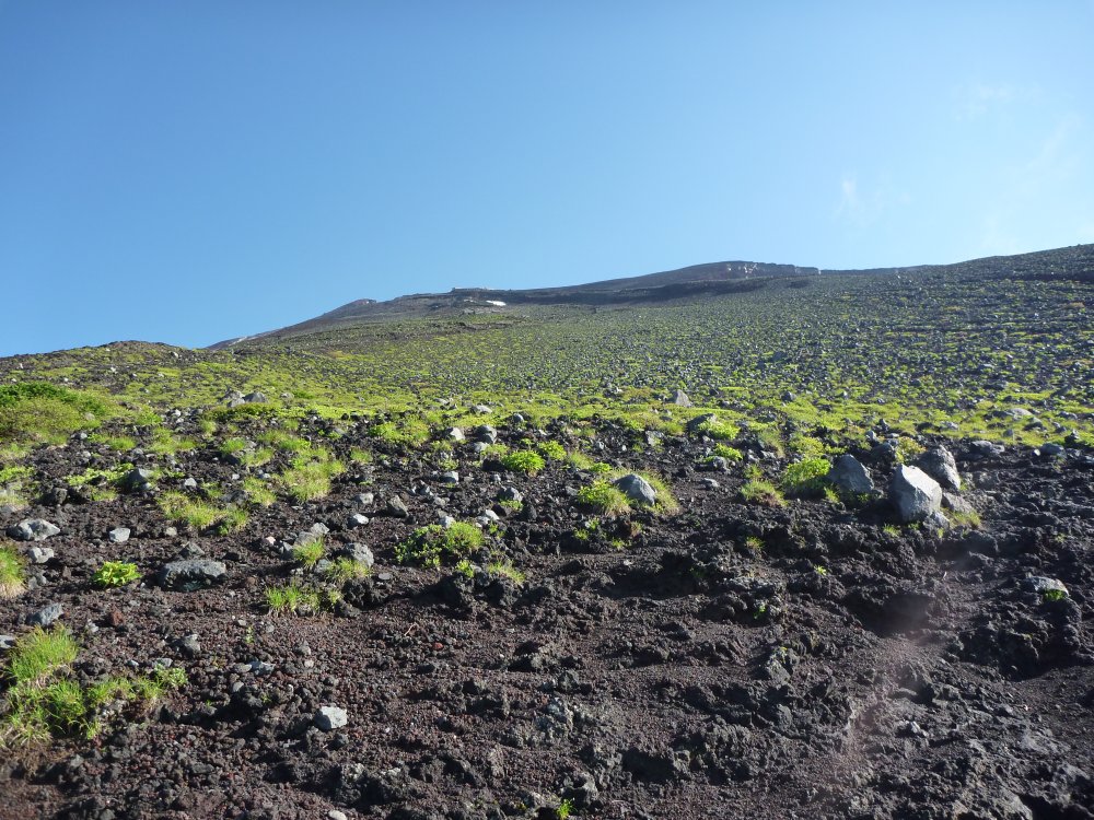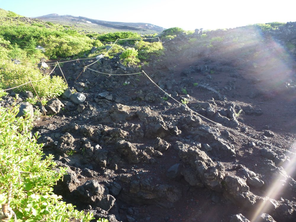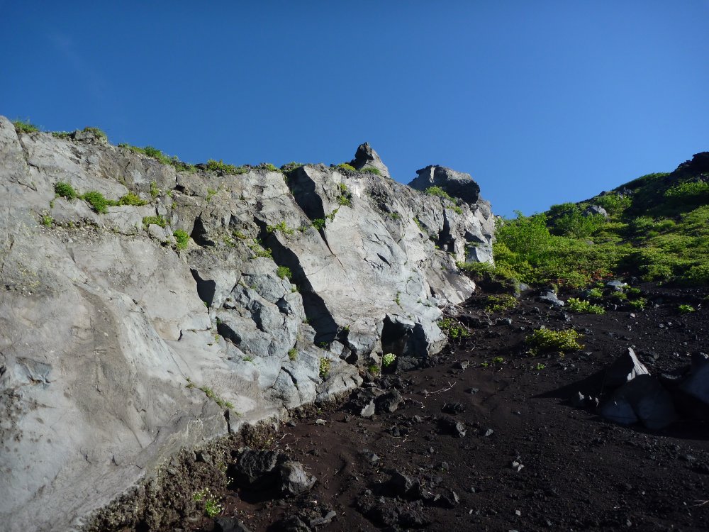 このルートは、岩の下に見えるような、こんな感じで固まった黒土がほとんど。後は砂利と岩場。須走ルートや吉田ルートは、足がどんどん埋まる砂地で、凄く歩き辛い。登りはもちろんのこと、下りも体を支えないといけないので、足に凄く力がかかって、後半になるともうヒザとか笑いっぱなし。ヒザ大爆笑。