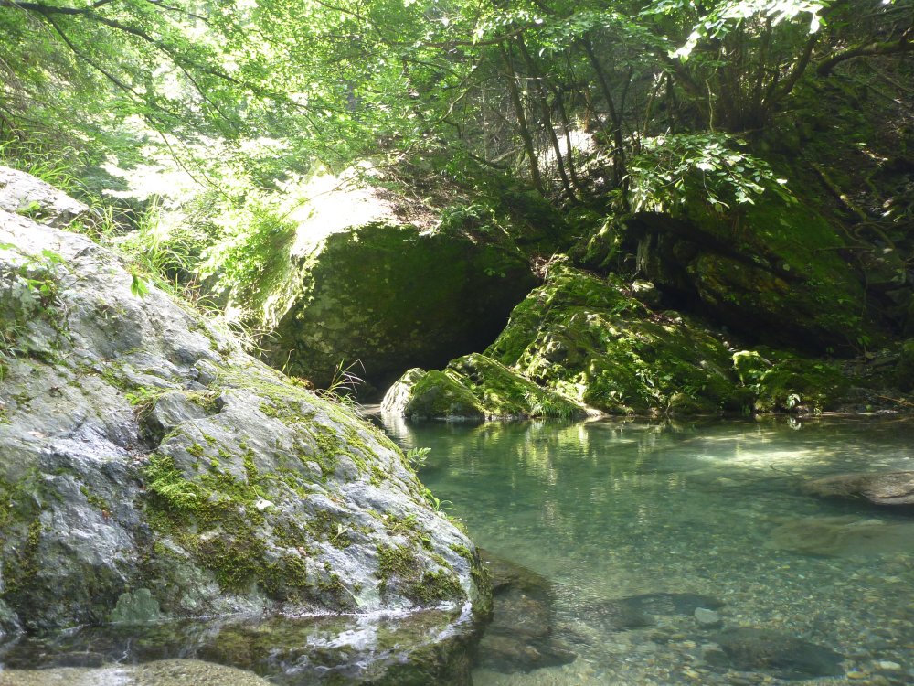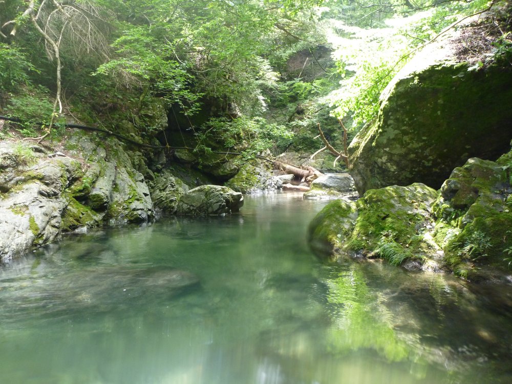 ここからはちょっと難易度が上がり、川の流れが急なところや、底が見えないほど深いところを行く事になります。そして、場所によっては川を避けていく必要があり、岩肌を登り歩くボルダリングの技術が少し要求されます。ボルダリング暦6年、認定10級(最下級)という天賦の才を持つ俺は、これらを余裕で泣きながらクリア!