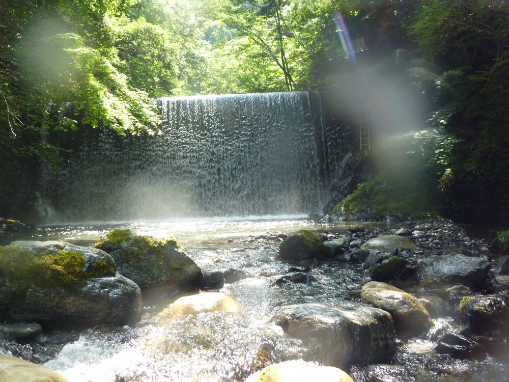 右側のハシゴから登り、帰りは飛び降りもOKな滝。