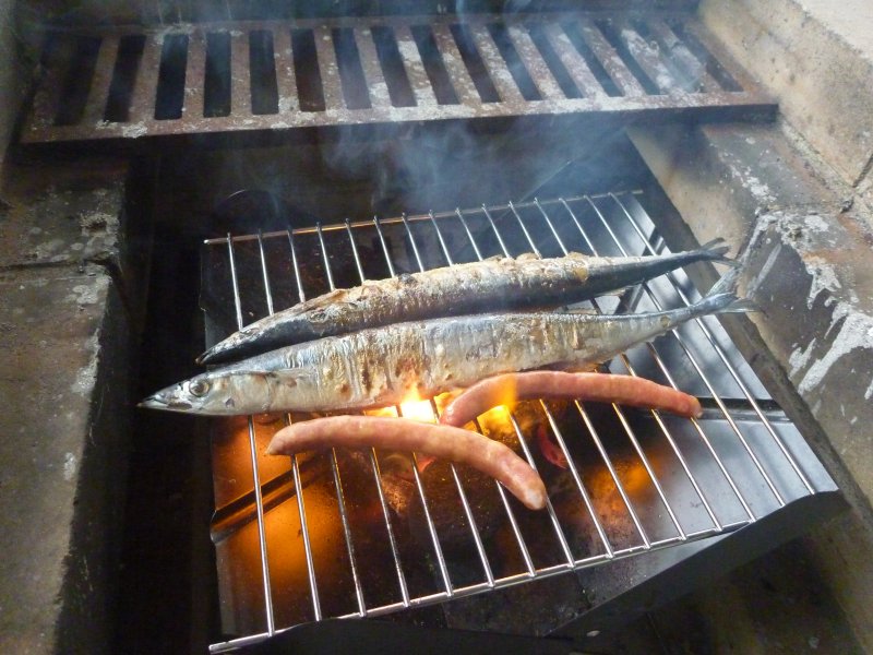 そこからぬるいビールをちびちびやりつつ、道中で買ったなんとかソーセージと、今年は高いといわれている秋刀魚(3匹で198円)を塩刷り込んで焼く。