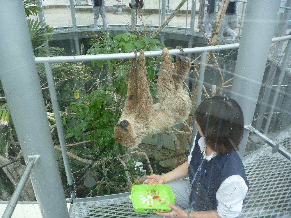 この右の写真はナマケモノで、エサをものすごいゆっくりした動作でおねーさんからもらって食べてた。こんな風にのんびり生きたいなぁとボケーっと眺めていると、俺に気付いたこのおねーさんが振り返り、俺を見て笑顔で会釈してくれた。