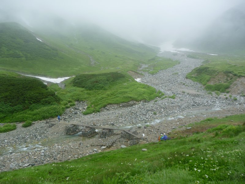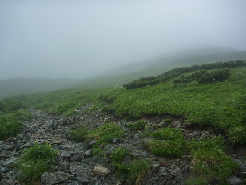 道が分かれていて、片方は雪渓だらけで要アイゼンとなっていたので、ノークランポンな俺は、もう片方の道へ。