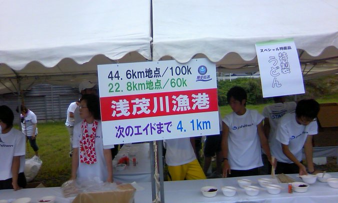 この時間まで走ってる人は少なくて、ほとんどは後ろから来た60キロの方々。ゼッケンの色で100キロの人かどうかは分かるので、ひとりだけいたお仲間に声を掛ける。