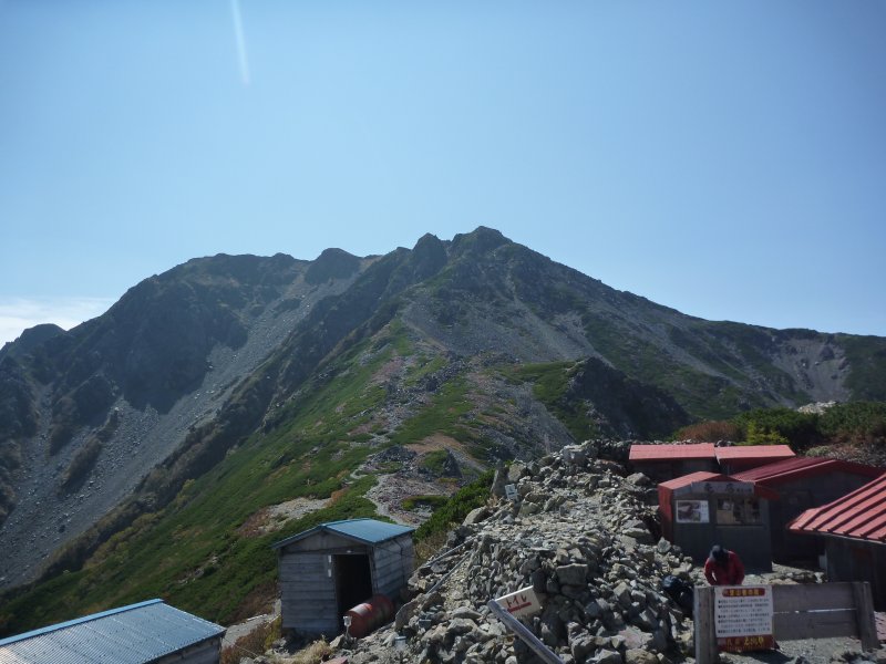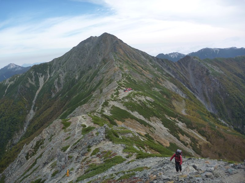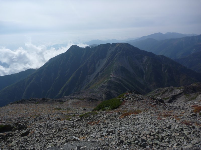 あれを越えていかないと、今日の宿泊地にはたどり着けないんだよー。しかもそれまでに、間ノ岳というピークも越えるし下りもあるし、宿泊地はそこからさらに1300メートルぐらい下らないといかんしで、初日もキツかったけどこの日もキツかった。