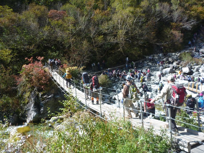 道が細いもんだから、すれ違うのにいちいち全体が立ち止まる事になり、おまけにいつまでも途切れないもんだから、誰かが音頭をとって片側通行の指揮をする必要もあり。なんだこれ?