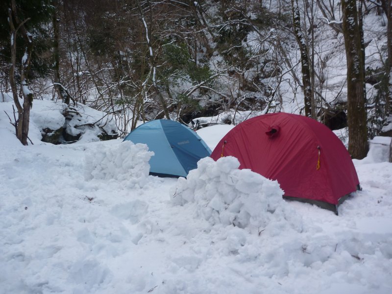 雪の中、わりと頑張って登って上のほうにテント建てた。翌朝、テントの前を犬つれたマダムが散歩しとった。犬は服着てた。