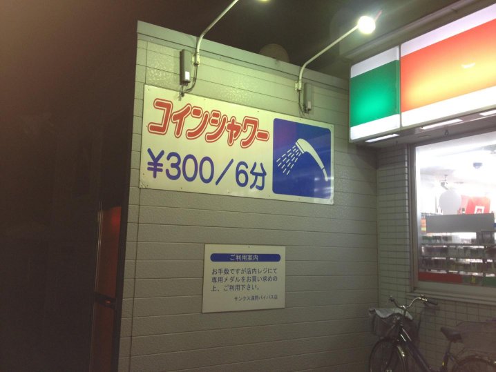 近くにコンビニ(サンクス)があり、なんとコインシャワー設備搭載。