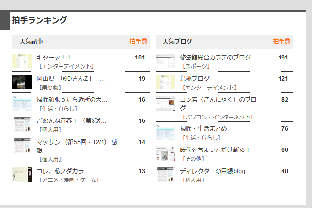 最近の記事を改めて見直してみると、なんか5つとか6つとか拍手もらえてたりする記事もあるし。