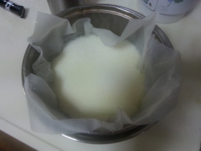 1.材料全部混ぜて60℃くらいに温めてペーパータオルを敷いたザルに漉して1時間放置
