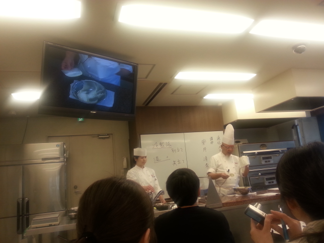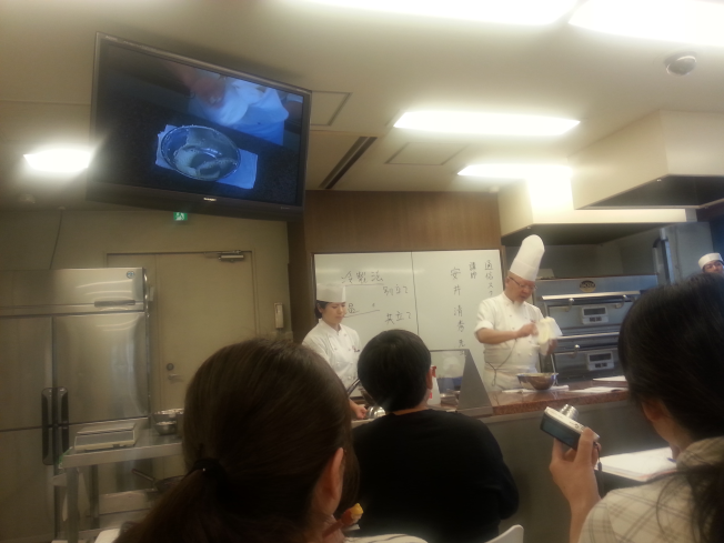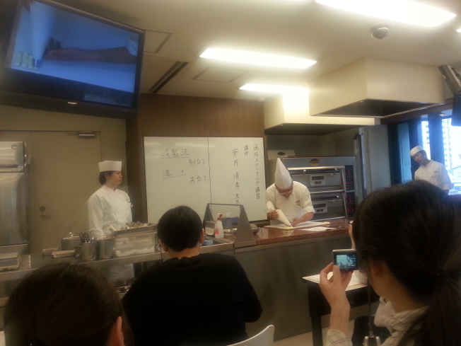 左上のモニタで、先生の手元を映してくれます。右に立っているイケメンが、カメラを手操作で先生の手元に合わせてくれます。たまに、先生が移動しているのに放置され、何にも写ってない時があります。その時には伸び上がって先生の手元を見るんですけど、その頃にはもうその作業が終わっていたりして、地味に困る。