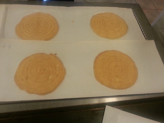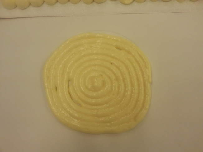こんな感じで、側面になる縦長の絞りを繋げたものと、底面になるうずまき生地を作成します。同じ長さ、同じ太さになるべきなんですが。