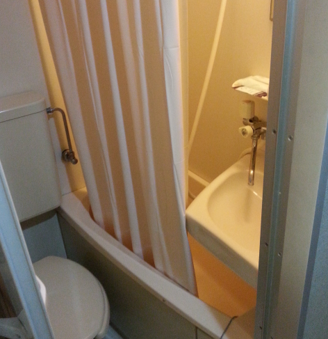 更に、このカーテンがほとんど動かず、全部開いてもバスタブに体を入れることの出来る空間は、ごく僅か。バスタブに入ったら入ったで狭すぎて、体を回転させるのは相当大変で、トントン相撲みたいな動きで小刻みに回転する必要があります。全裸で。