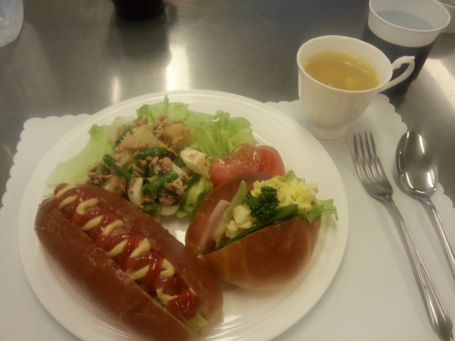 シャルロットのガワとなるビスキュイ生地を焼いている間に、ぱぱっと昼食です。